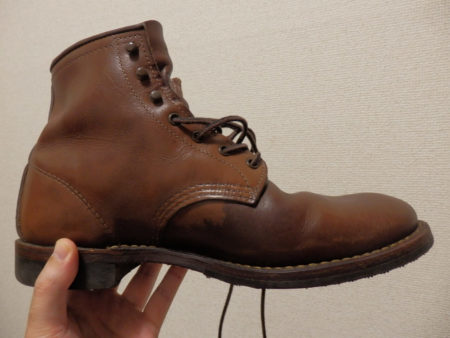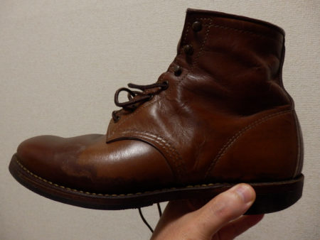 つま先あたりを見ると、雨が革に入り込んでシミになっているのが分かります。