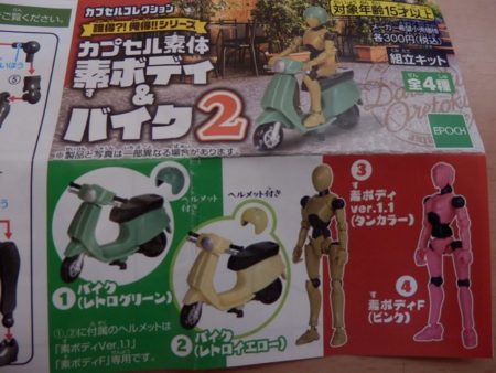 ラインナップは全4種類。バイク(レトログリーン・レトロイエロー)と素ボディタンカラー・素ボディFピンクです。今こうしてみると、素ボディFのピンクがビビットなカラーでかわいいのでほしかったですね。ちょっと後悔。