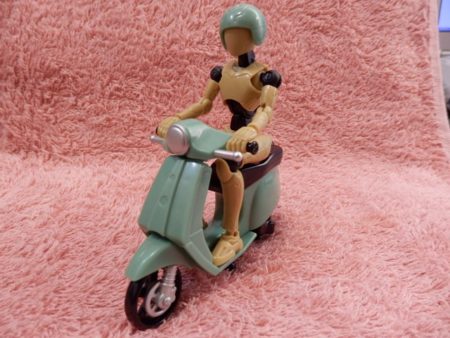 こうして乗せて見ると、素ボディのタンカラーはレトロバイクのカラーに合っていますね。バイクの方は、ハンドルを動きますし、タイヤもクルクル回るので、ブーンつって走らせることができます。