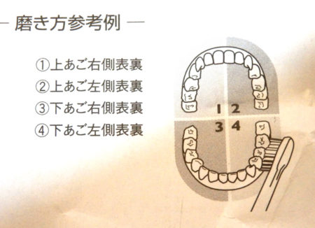 お口の中をイラストのように4か所に分け、それぞれをって位の間隔(30秒)で磨くことができます。2分間のブラッシング時間中に、30,60,90秒ごとに短いビープ音がなります。