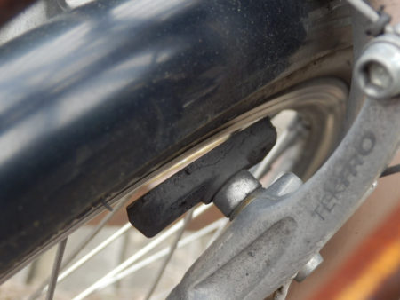 ブレーキシューの山が限界まで無くなっています。これ以上続けて使用するとホイールを傷めてしまいます。