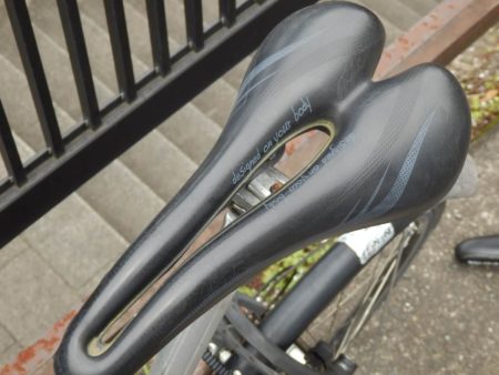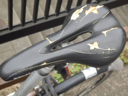 これは、ノーマルから交換した安いサドルですが、経年劣化でボロボロになってしまいました。交換したいところですが、依頼した行きつけの自転車屋さんに良いサドルが無かったため今回は交換保留です。