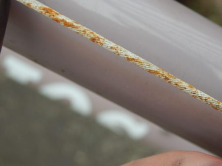 ブレーキワイヤーです。アウターがボロボロに剥がれてきたので、雨がそのままワイヤーを錆びさせています。ワイヤーのほつれはないのですが、もちろん交換です。
