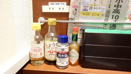 実際に座った目線はこんな感じになります。棚が見えるだけなので前に座っている客も見えることなく集中して作業に打ち込めます。棚にはコンセント、調味料他メニュー・フォークナイフが入っている箱、ナプキンがあります。全く無駄がない作りになっております。