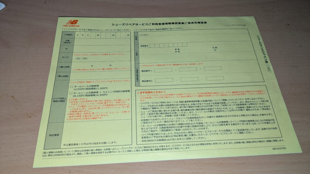 ニューバランスの「公式リペアサービス」に電話で申し込みます。