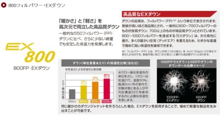 800~1000フィルパワーに達するEXダウンはかさ高性に優れ、多くの暖かい空気を蓄えるためわずかな重量で極めて高い保温性を確保できます。