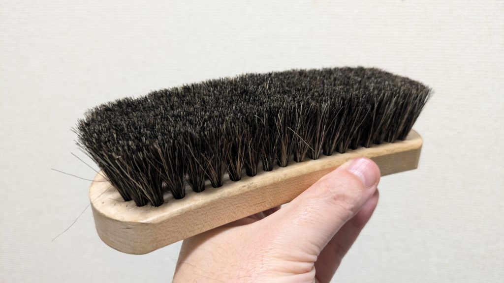 これだけです!豚毛などの硬いブラシではなく、柔らかい馬毛ブラシを使うのがポイント。表面のホコリを落としつつ、スエードの毛並みを整えてあげるだけで、ピッグスキンの美しいマットな質感がしっかりと保たれます。