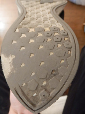 このぐらいソールがすり減ってくると、泥の所で滑ってしまいます。実際数回滑ってしまいましたので注意が必要です。