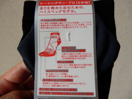 靴下屋で有名な日本の靴下専門店タビオが、スポーツ用に開発したのがタビオスポーツソックス。今回購入したのはその中でもランニング、レース用に特化した「レーシングラン・プロ」というモデルです。日本製でお値段は1800円(税抜き)です。