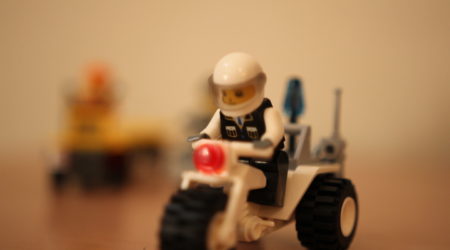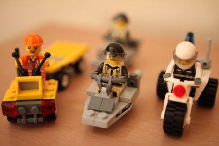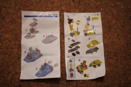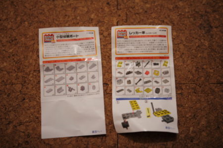 LEGOじゃないなっていうのは確信しました。4つ買いまして、当たったのは「小型偵察ボート」×2・「ポリスバイク」・「レッカー車」でした。12種あるのに被ってしましました。